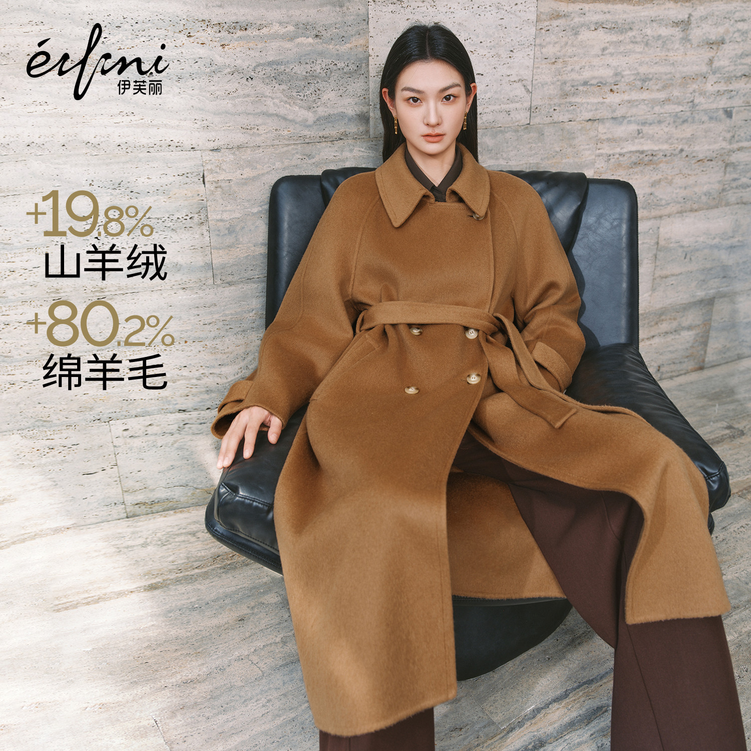 伊芙丽定制散毛染羊毛羊绒双排门襟系带驼色毛呢外套女2025冬新款