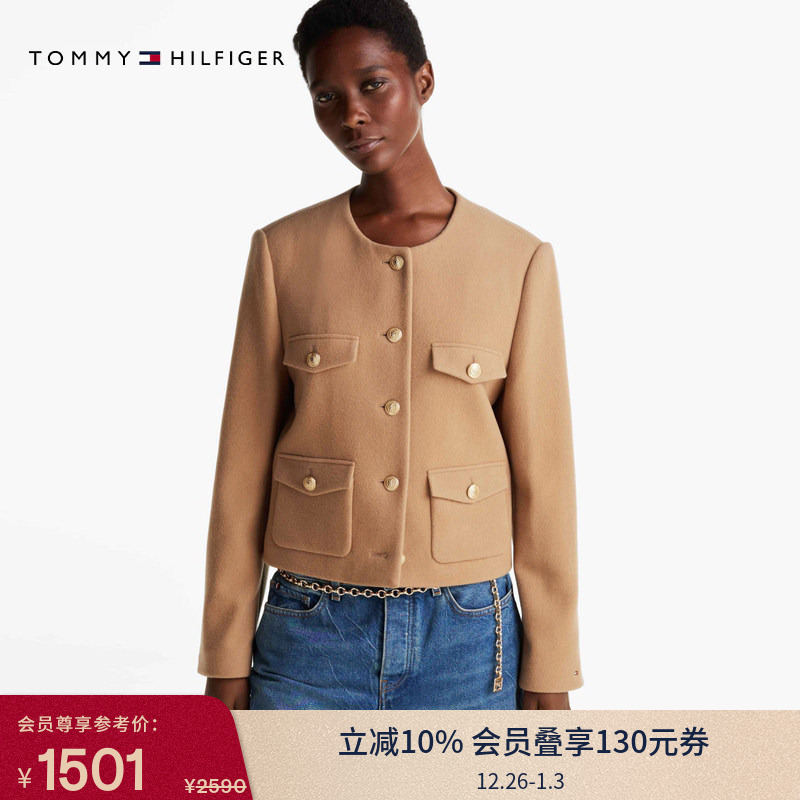 Tommy25春夏新款女装羊毛混纺气质优雅圆领金属扣驼色毛呢短外套