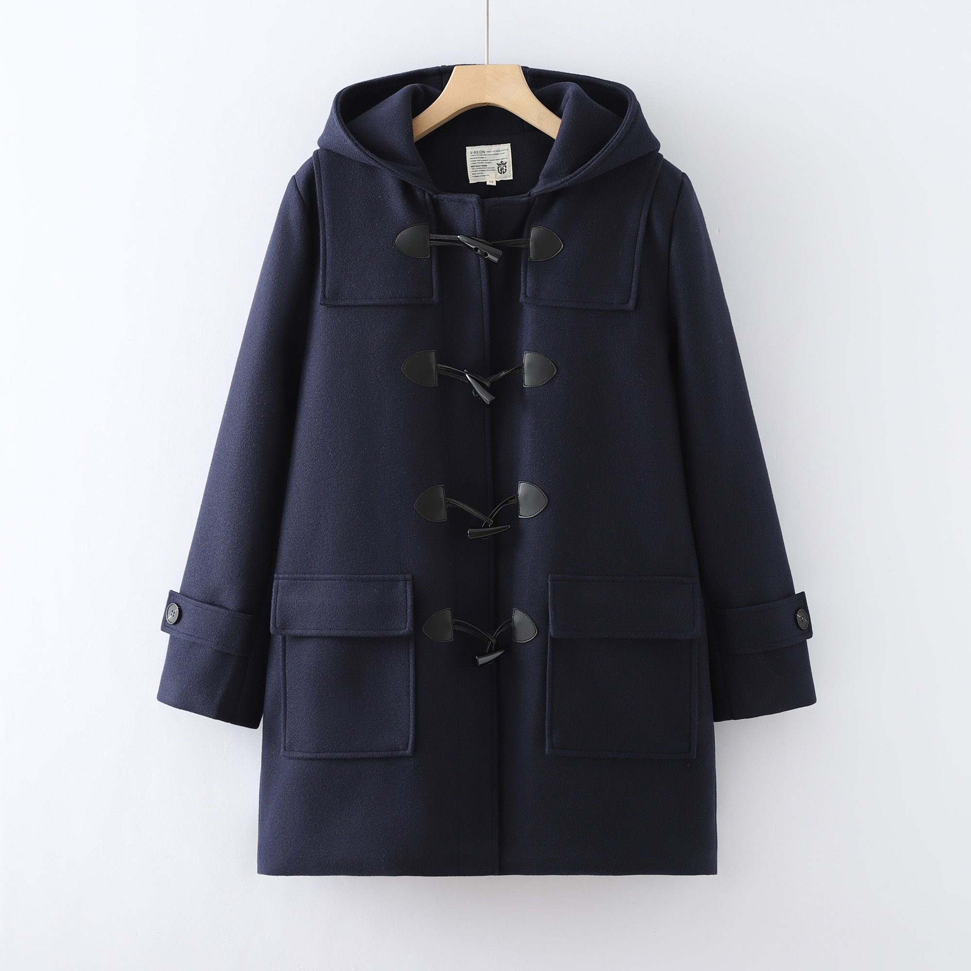 木村叔dK日系牛角扣毛呢大衣男女学生藏青绀色连帽中长款呢子外套