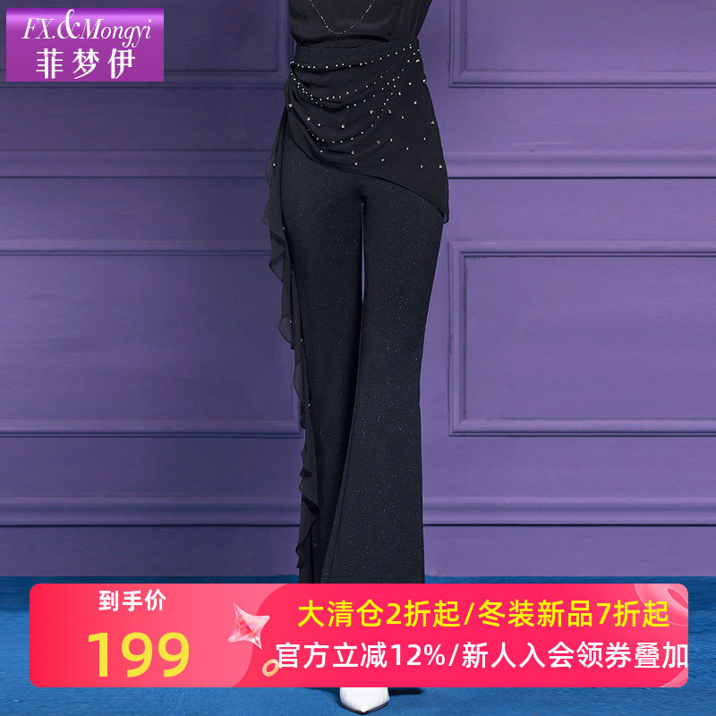 菲梦伊原创设计辣妹风荷叶边黑色微喇裤女高腰时尚气质休闲长裤子