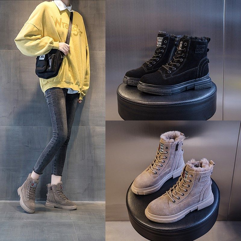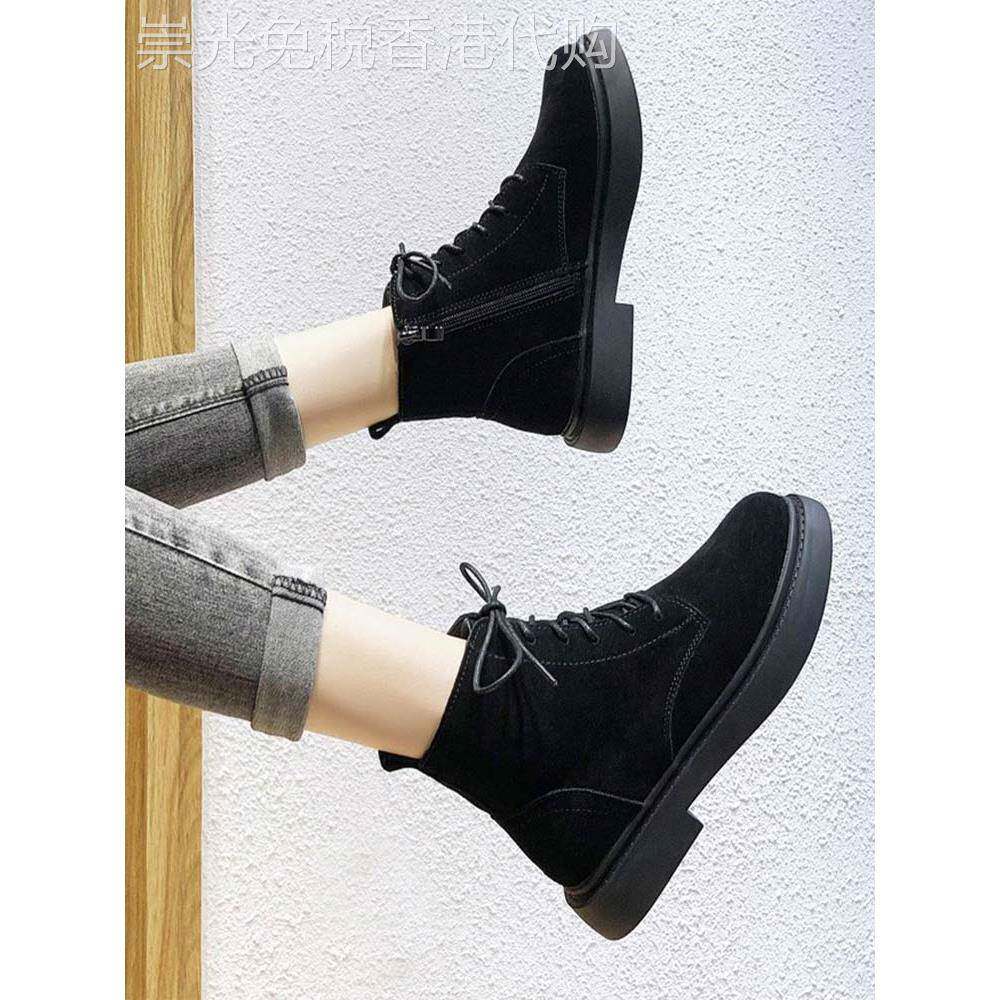 2022b秋冬季加绒磨砂马丁靴女百搭翻毛皮短靴平底真皮英伦风棉鞋