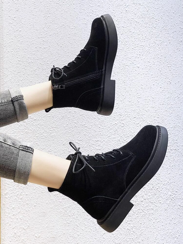 英伦风真皮磨砂短靴女2024春秋新款翻毛皮马丁靴爆款平底系带单靴