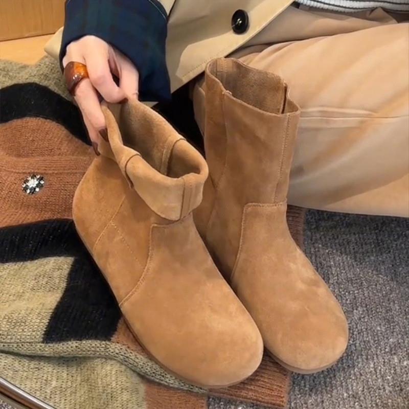 正品高货网红款复古文艺翻毛皮平底短靴女2025新款百搭圆头堆堆套