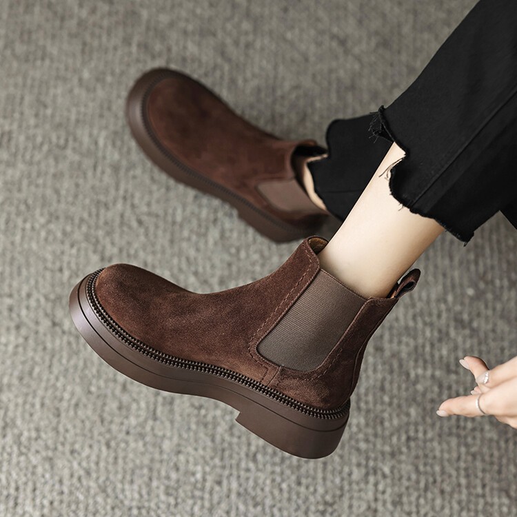 翻毛皮短靴女靴春秋单靴圆头中跟平底靴真皮磨砂皮棕色切尔西靴女