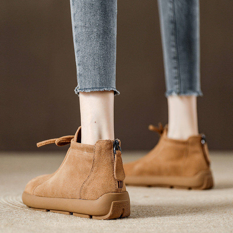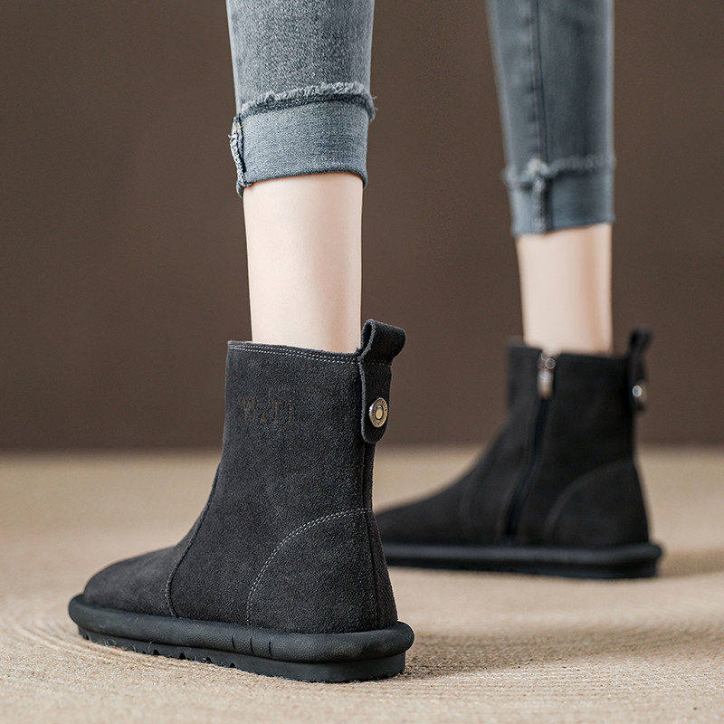 2024年秋季新款真皮翻毛皮马丁靴女圆头后拉链加绒平底短靴棉靴子
