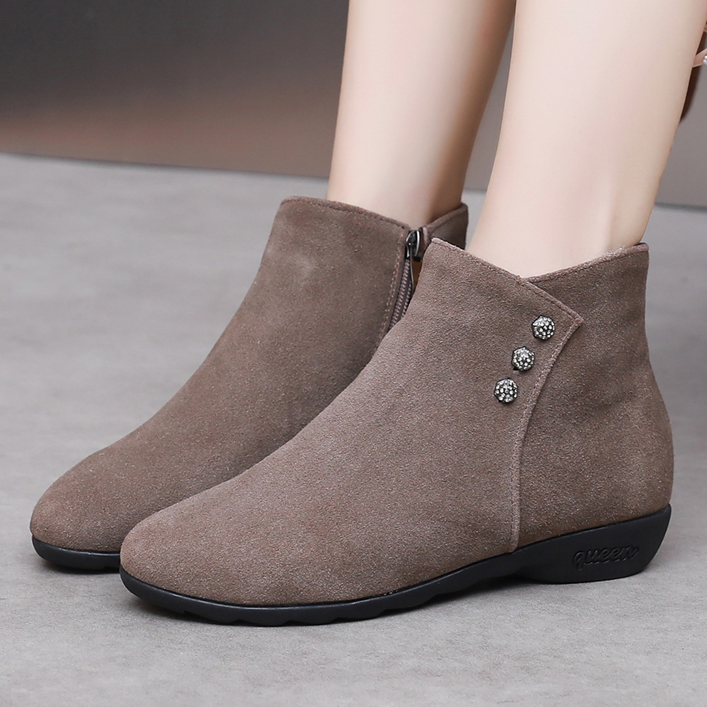 磨砂真皮平底短靴女春秋单靴低跟妈妈靴子翻毛皮冬季加绒保暖女鞋