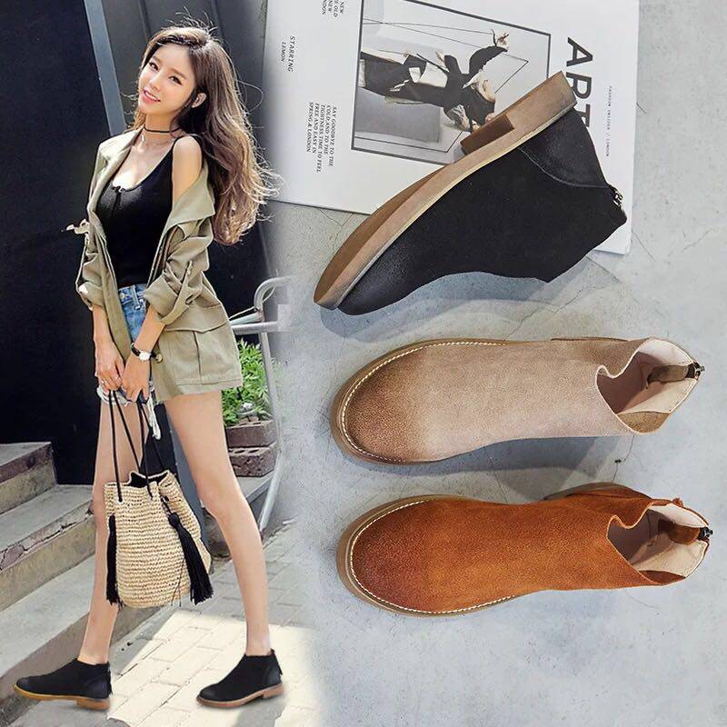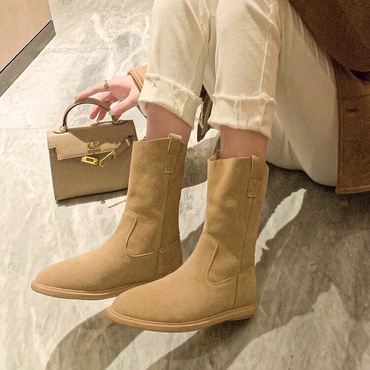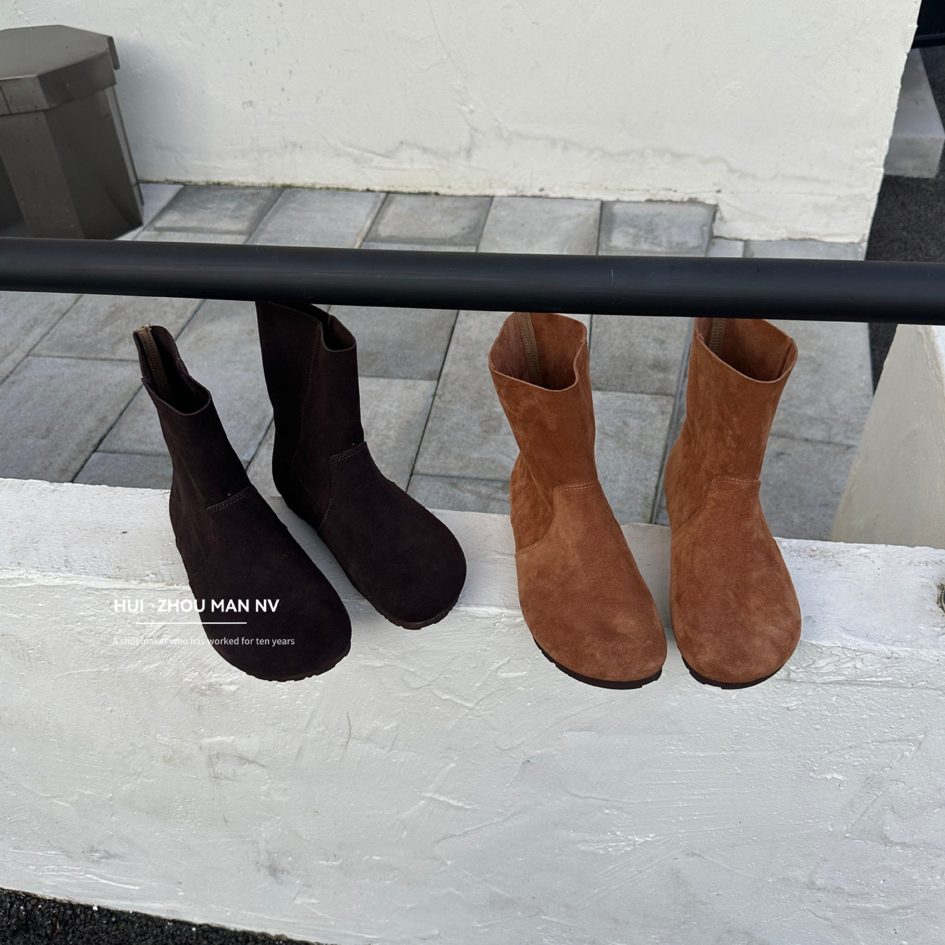 2025秋季特价断码翻毛皮平底短靴女百搭套筒不累脚显瘦博肯时装靴