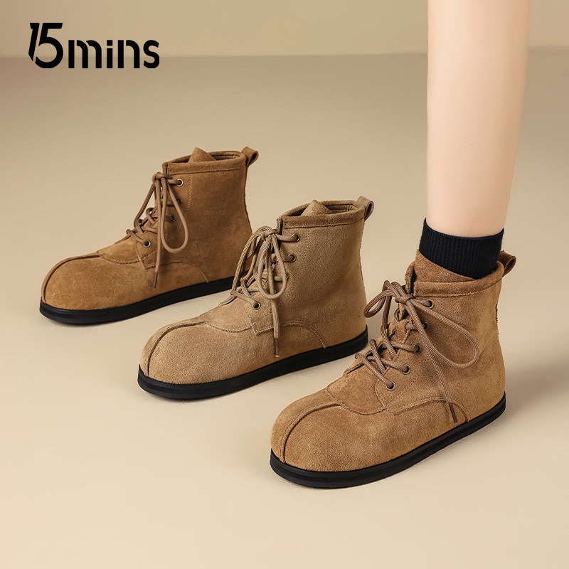 15mins复古翻毛皮短靴女2025秋冬季新款平底系带马丁靴时尚工装靴