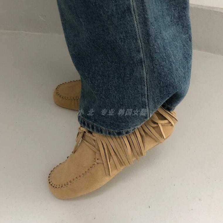 2024春季复古磨砂真皮翻毛皮流苏系带短靴女平底休闲短筒靴马丁靴