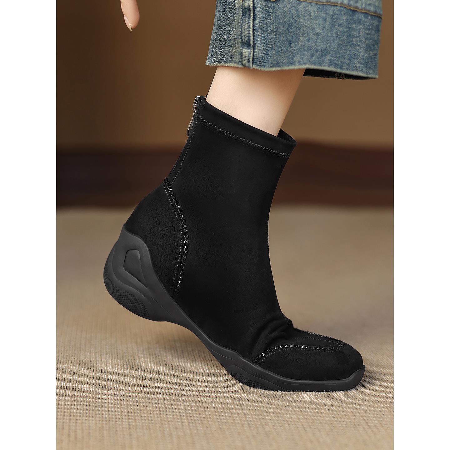 翻毛皮短靴女春秋单靴软底方头水钻中跟平底靴内增高磨砂皮弹力靴