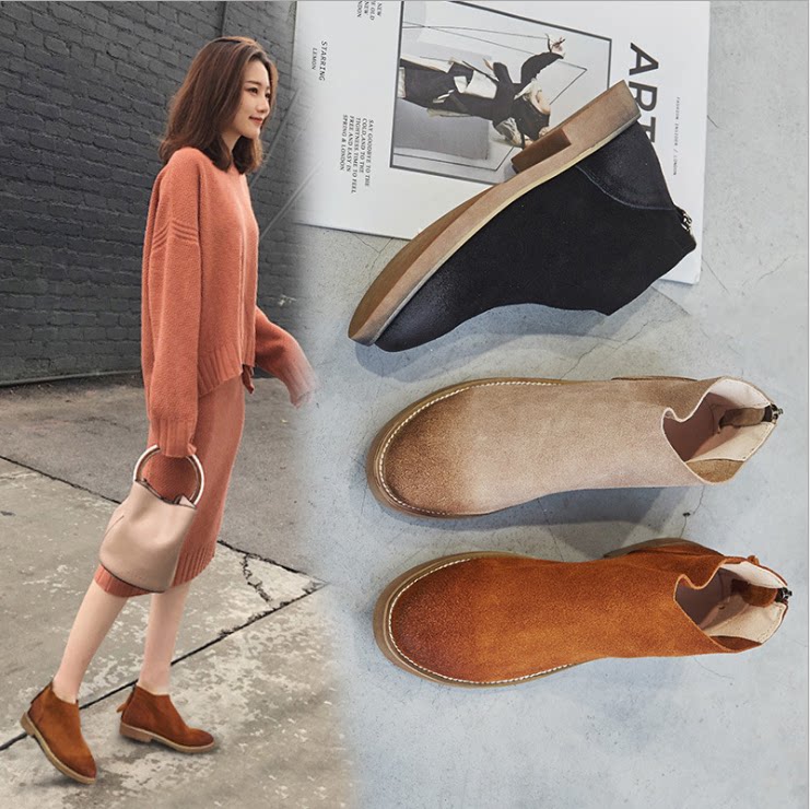 2024春季新款磨砂真皮女平底百搭英伦风复古圆头短靴翻毛皮马丁靴