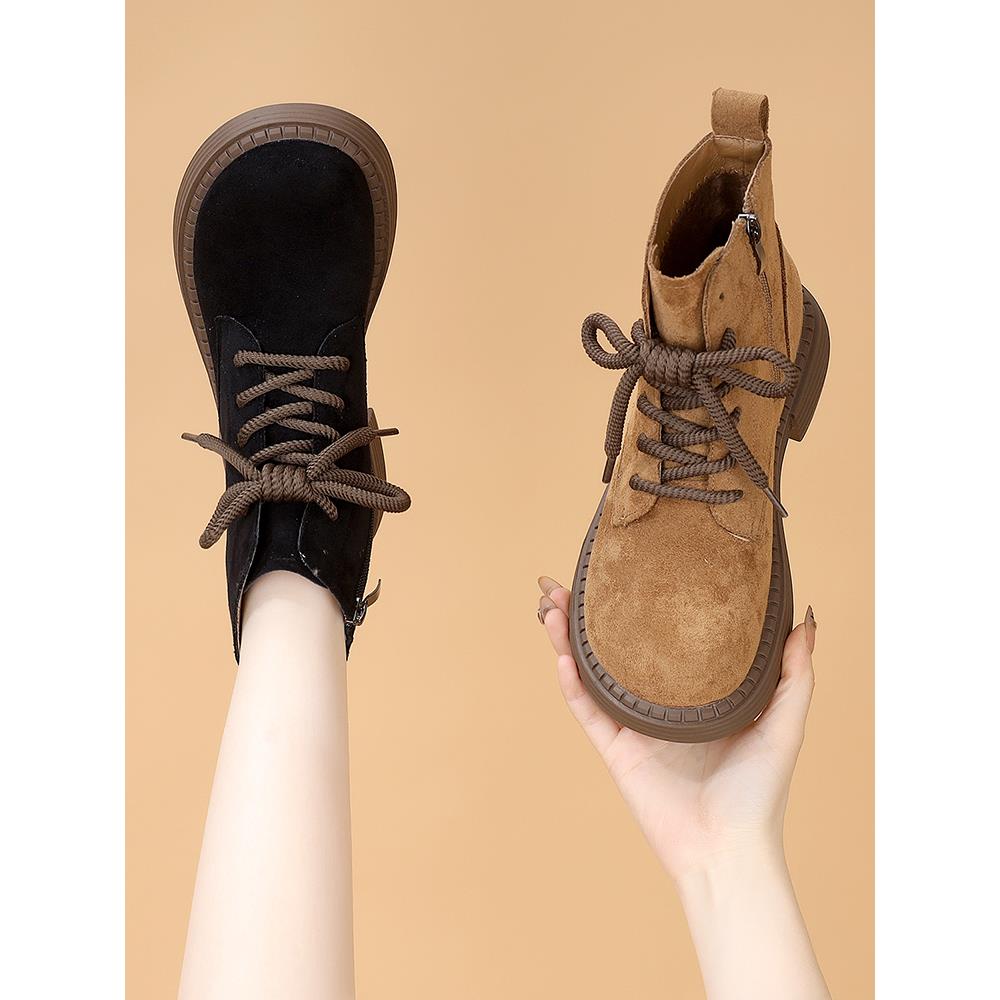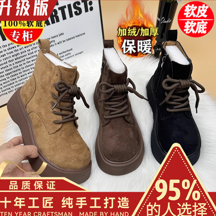 翻毛皮厚底马丁靴女2025年秋冬新款加绒保暖平底短靴系带工装靴女