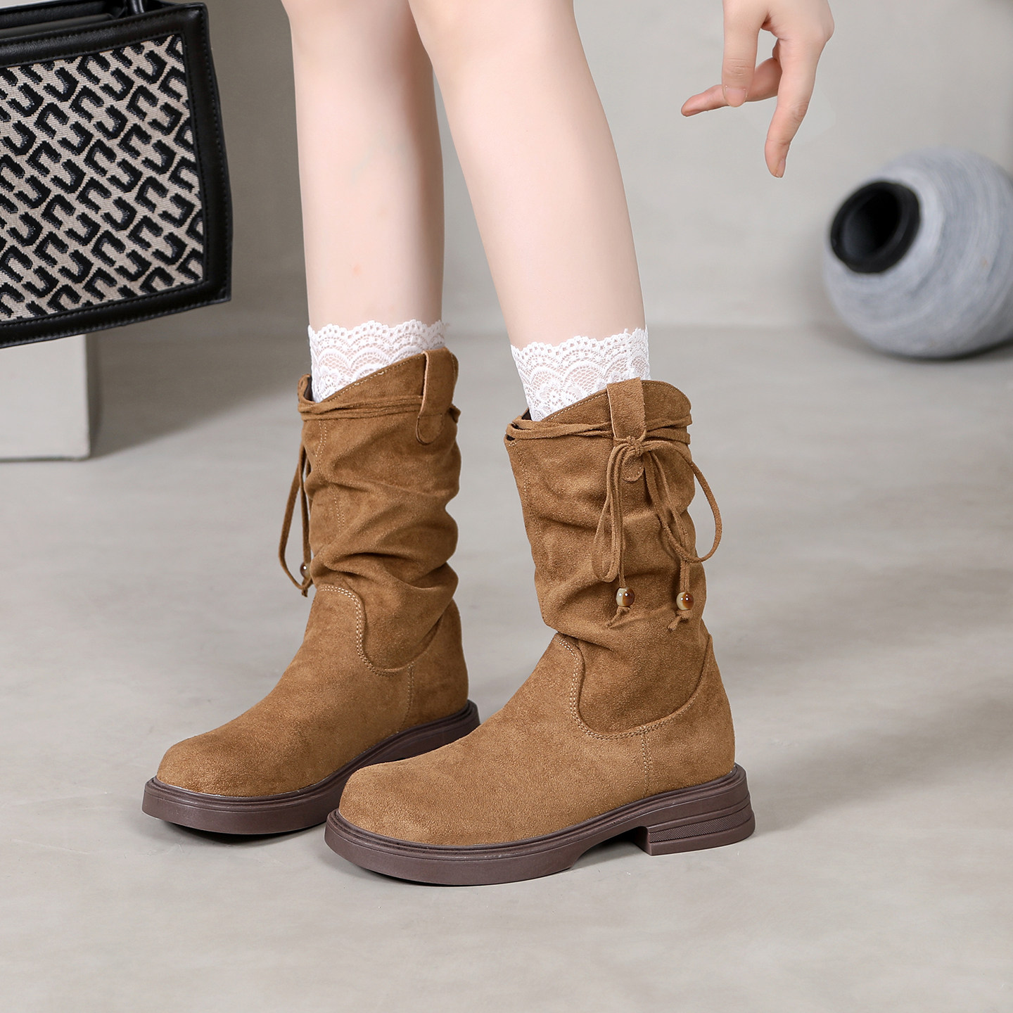 卡其色真皮平底韩系小短靴女春秋单靴软底中筒西部牛仔靴翻毛皮靴