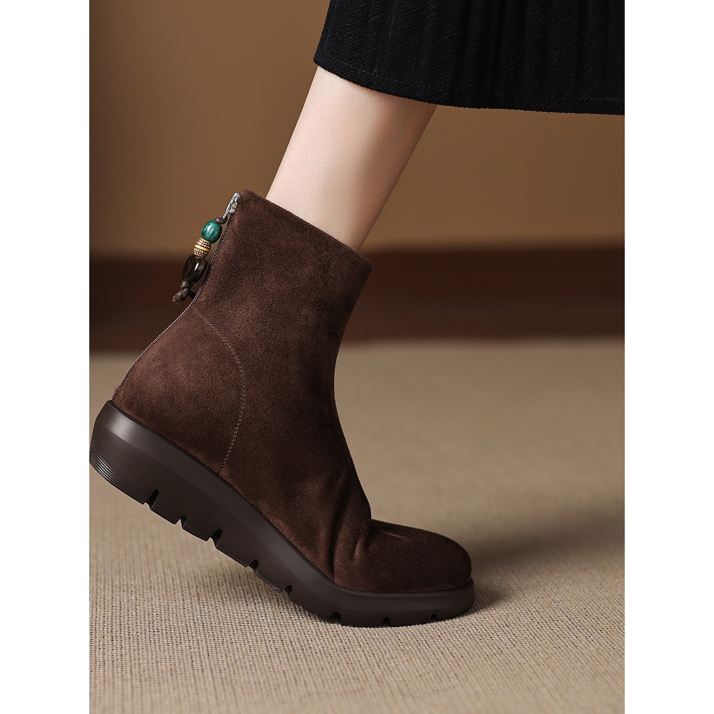 翻毛皮短靴女春秋单靴软底圆头低跟平底真皮坡跟棕色40磨砂皮加绒