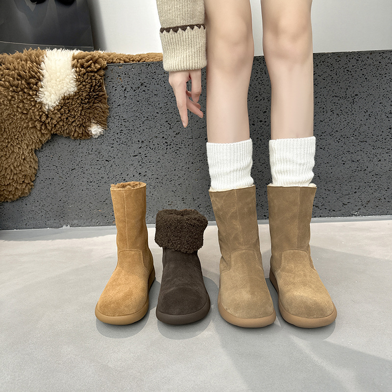 翻毛皮雪地靴女2025冬季新款慵懒风平底加绒真皮短靴子保暖大棉鞋