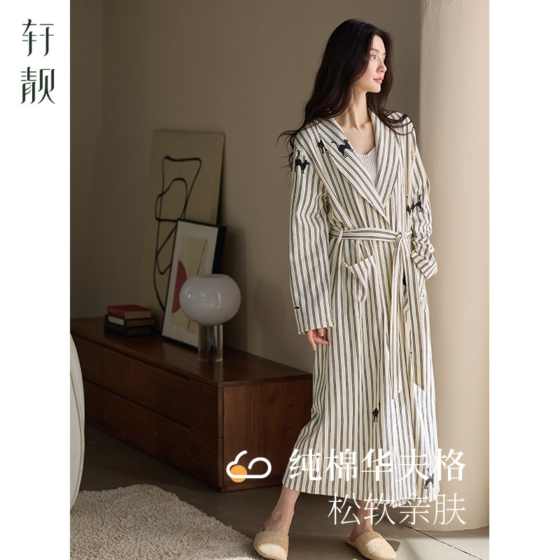 轩靓华夫格纯棉睡袍女士春秋季长袖条纹睡衣高级感浴袍大码家居服
