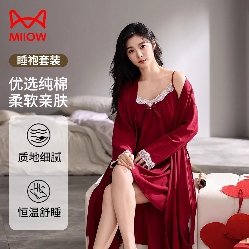 猫人纯棉睡袍女长袖秋冬新款浴袍2025性感女士吊带家居服可外穿