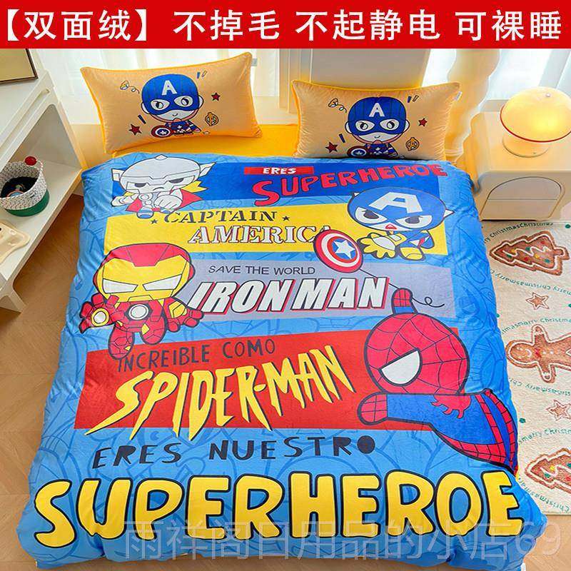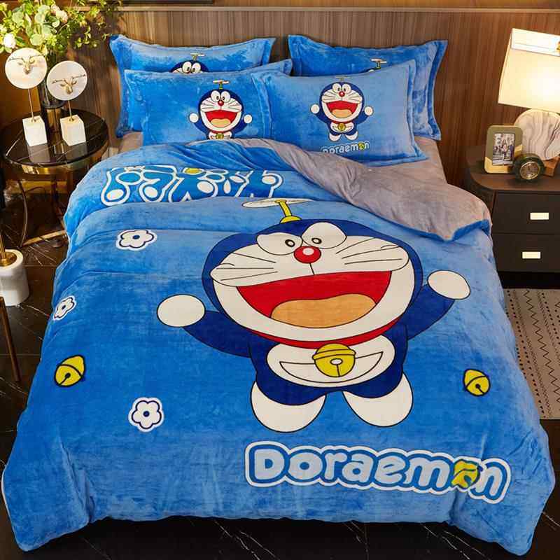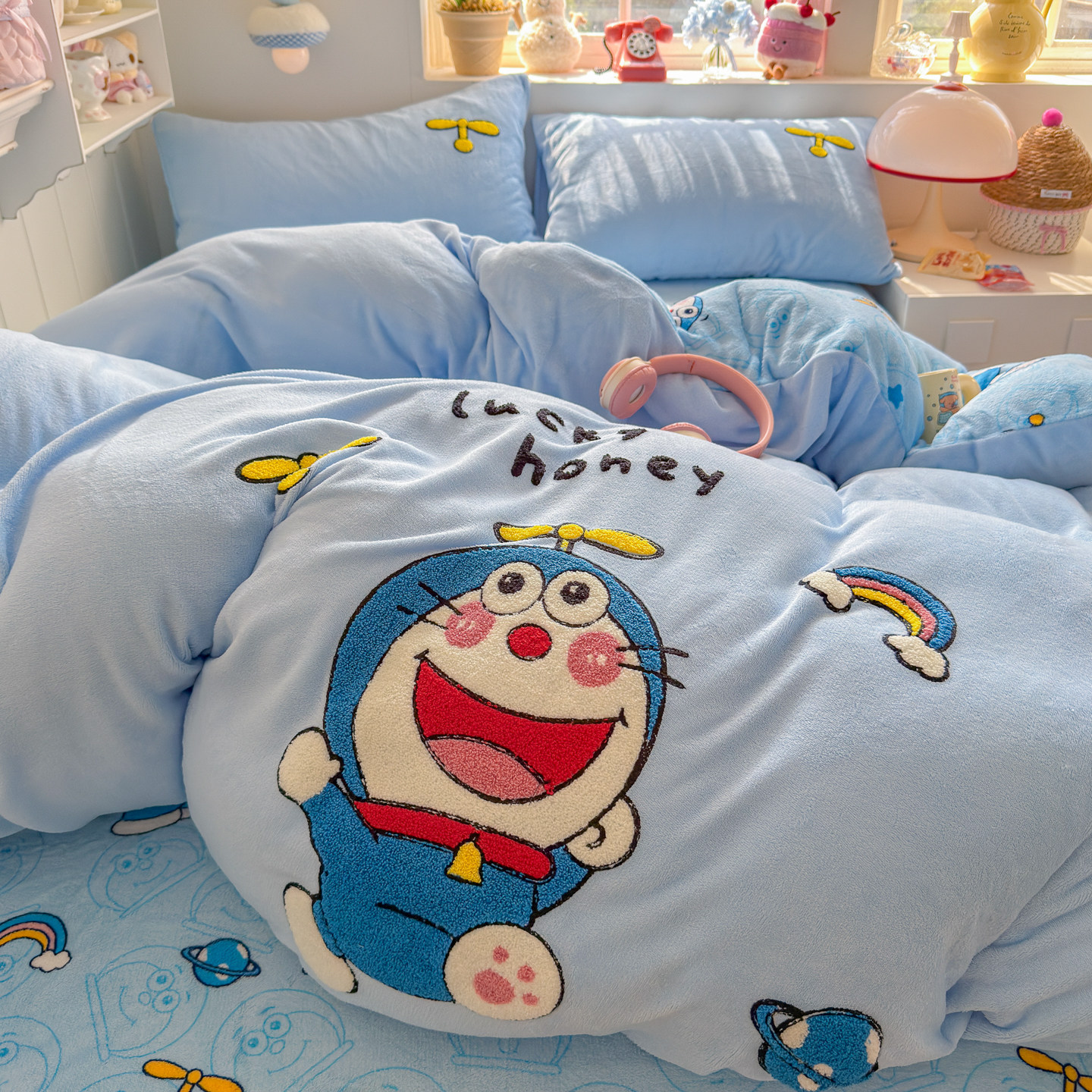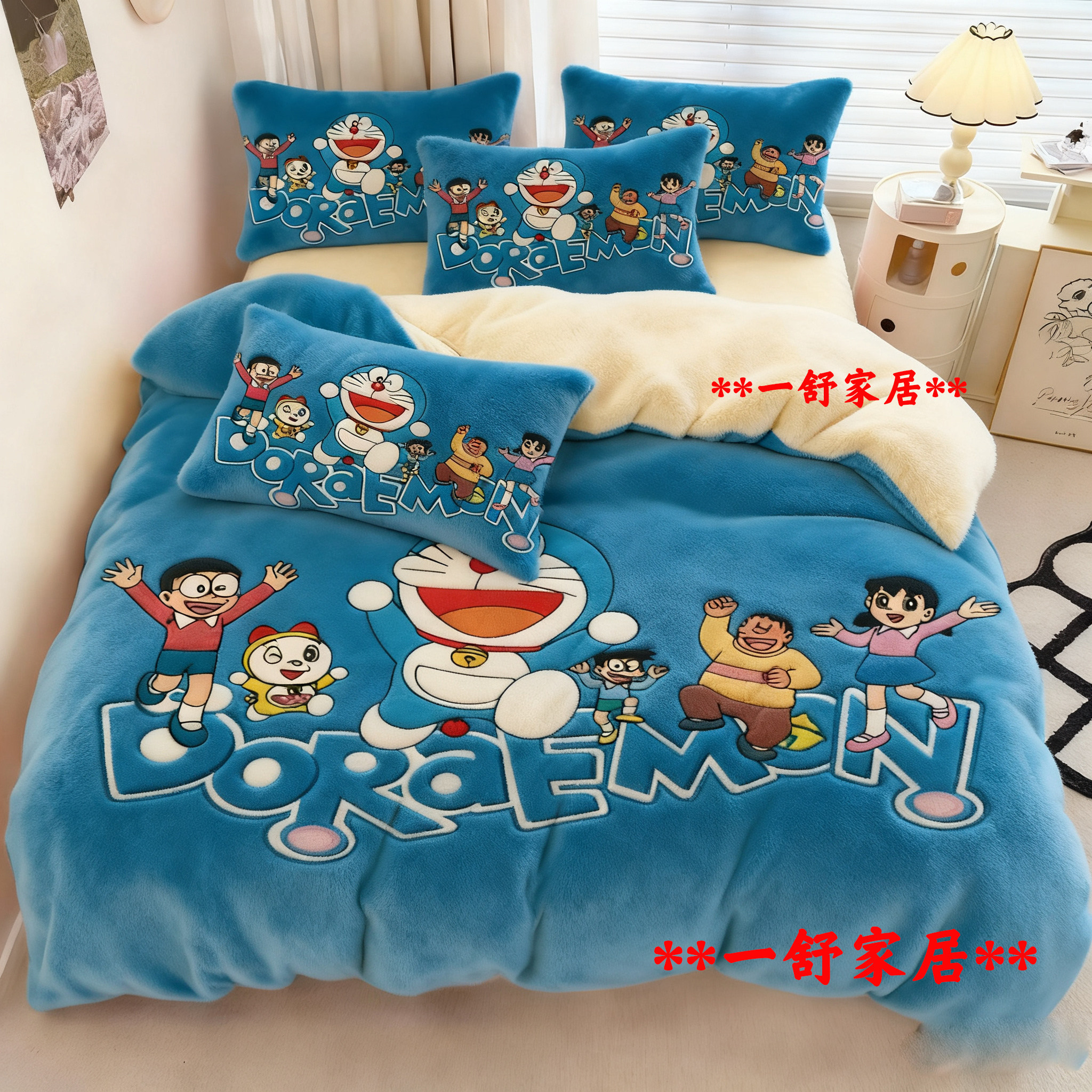哆啦A梦牛奶绒床上四件套儿童床单被套冬季卡通珊瑚绒三件套床笠