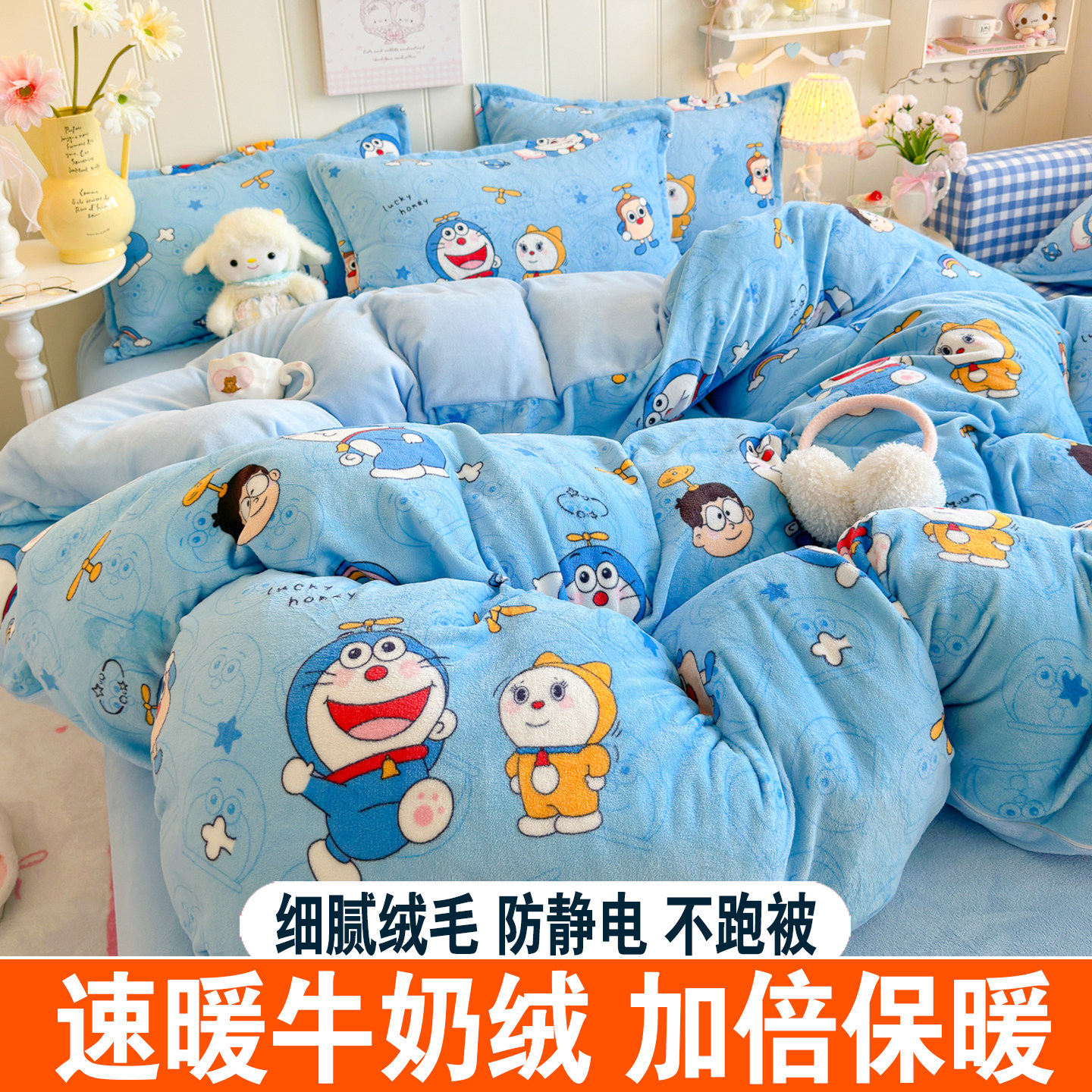 哆啦A梦四件套牛奶绒可爱卡通儿童房加绒学生宿舍被套床单床笠款