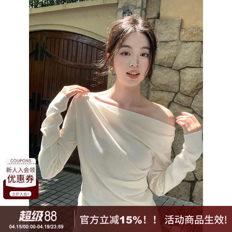 pusumede气质学姐 斜肩针织T恤女长袖修身显瘦高级设计感露肩上衣