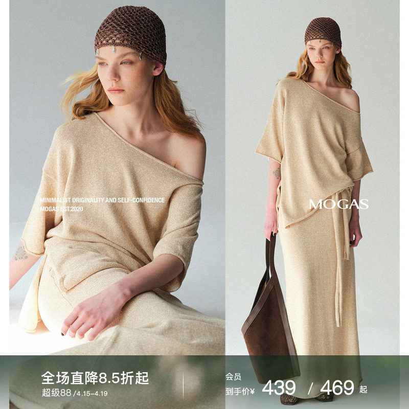 Mogas不费力出街套装 棉麻混花纱露肩宽松针织衫上衣系带半身长裙