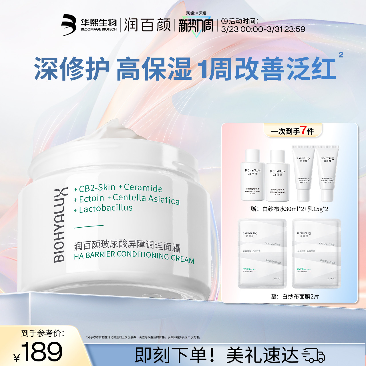 【淘宝秒杀】润百颜白纱布面霜屏障调理修护泛红补水敏肌华熙生物