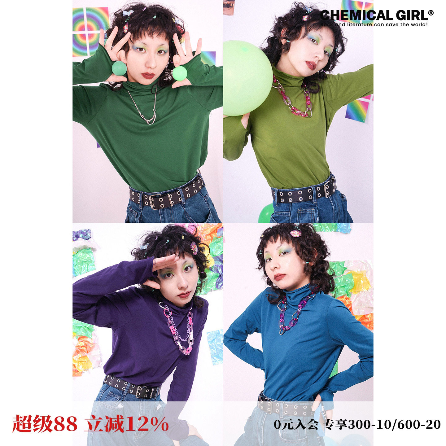 化学少女「色彩炸弹」针织半高领打底衫秋冬内搭修身长袖t恤上衣
