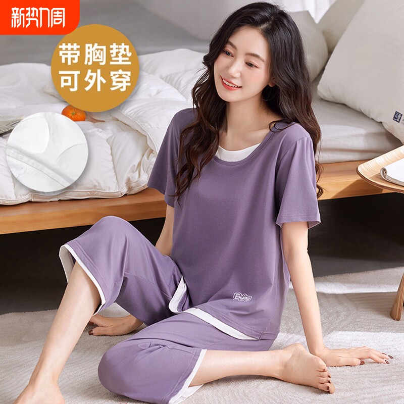莫代尔带胸垫睡衣女夏季短袖七分裤薄款韩版凉感家居服假两件套装