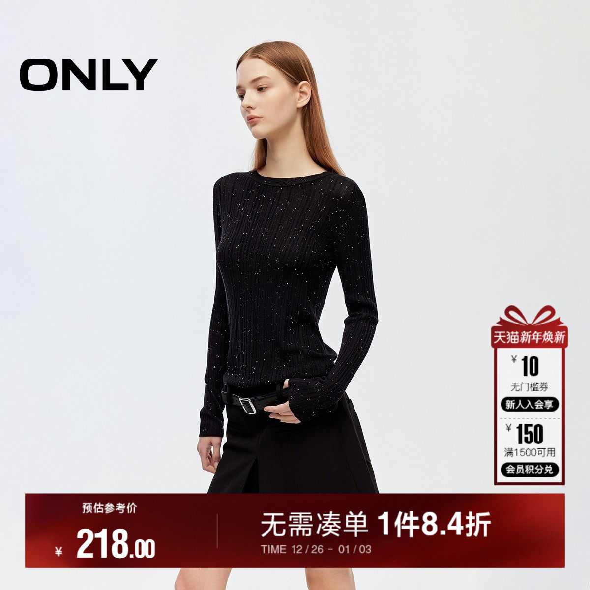 ONLY2025冬季新款圆领不规则坑条轻盈舒适修身亮片长袖针织衫女