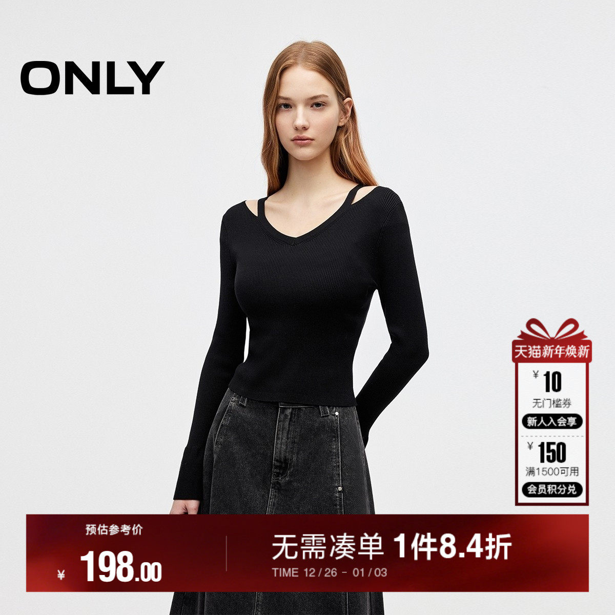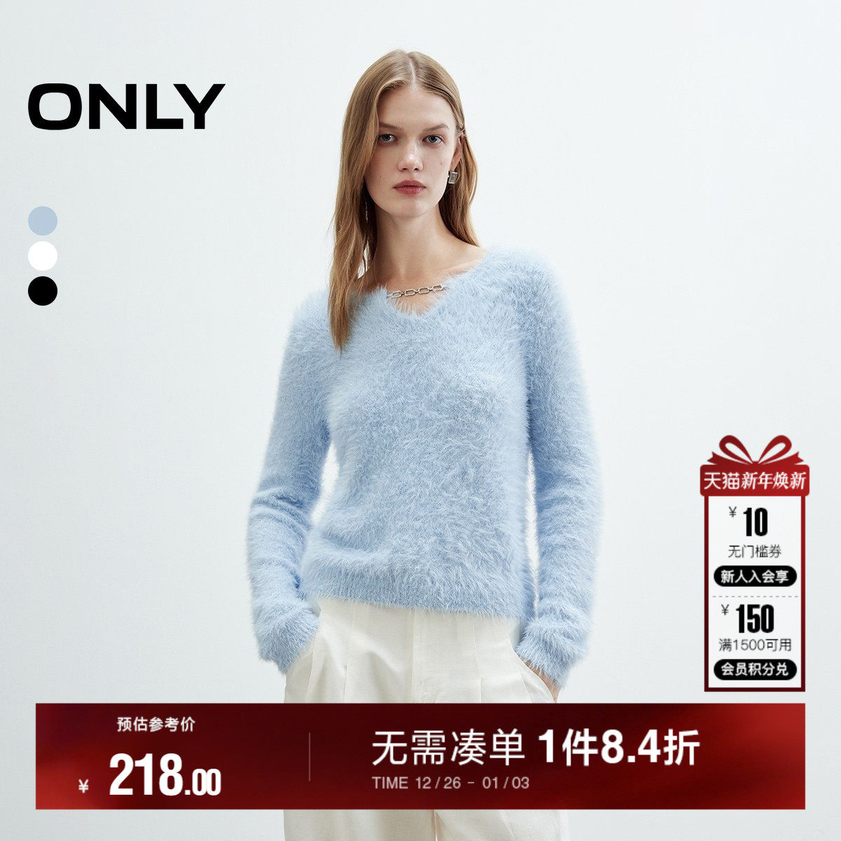 ONLY2025冬季新款软糯亲肤舒适松弛落肩长袖链条V领纯色针织衫女