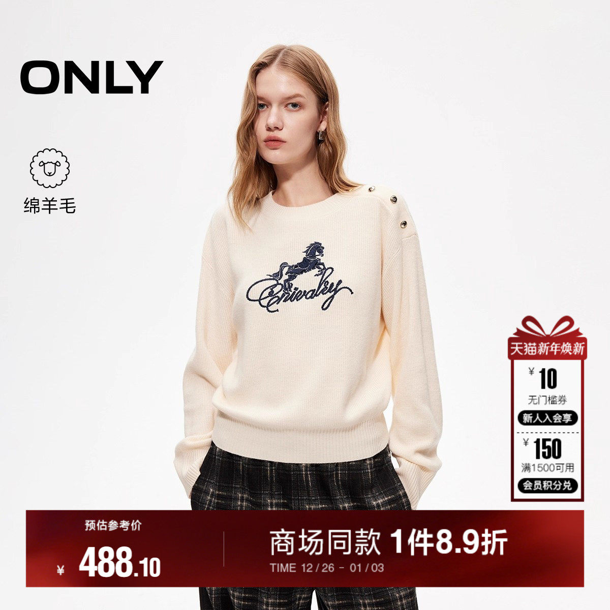 ONLY2026春季新款绵羊毛落肩纽扣装饰马年刺绣宽松复古针织衫毛衣