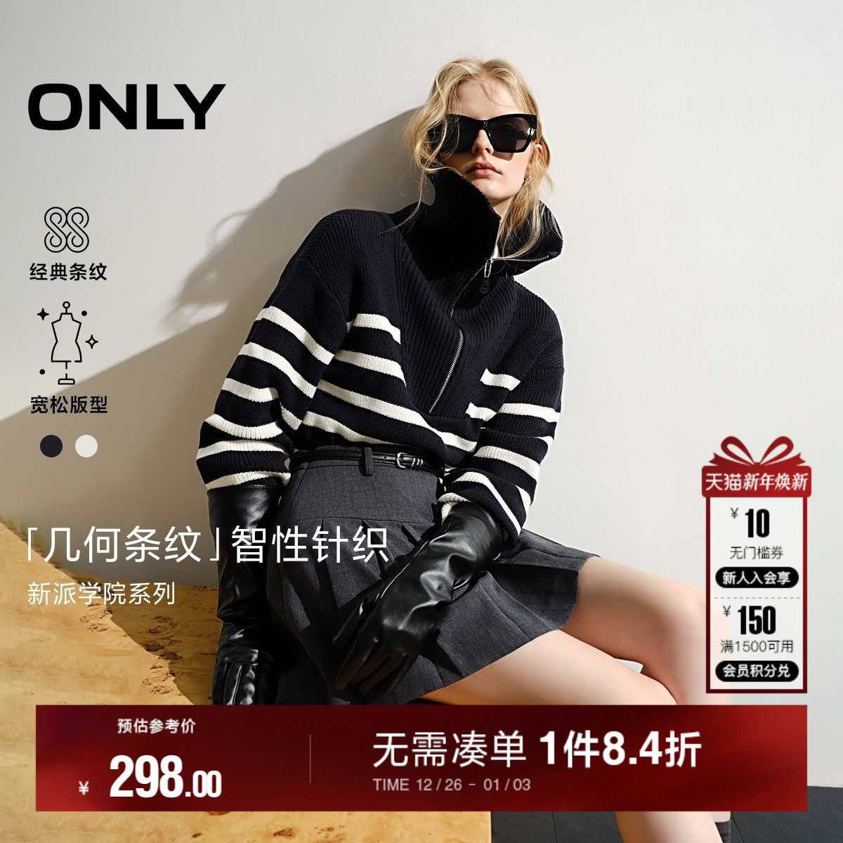 ONLY2025冬季新款海军风半开襟大翻领落肩通勤显瘦条纹针织衫女