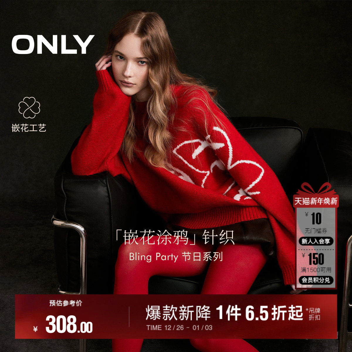 ONLY2026春季新款艺术感嵌花涂鸦撞色舒适软糯圆领红色针织衫毛衣