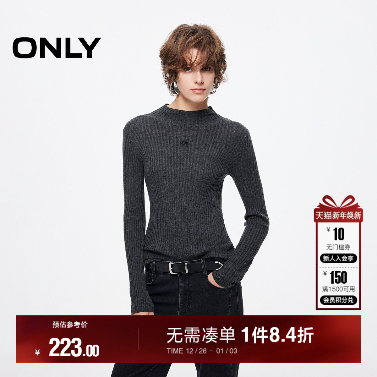 ONLY2025冬季新款半高领胸前字母点缀刺绣修身正肩长袖针织衫女
