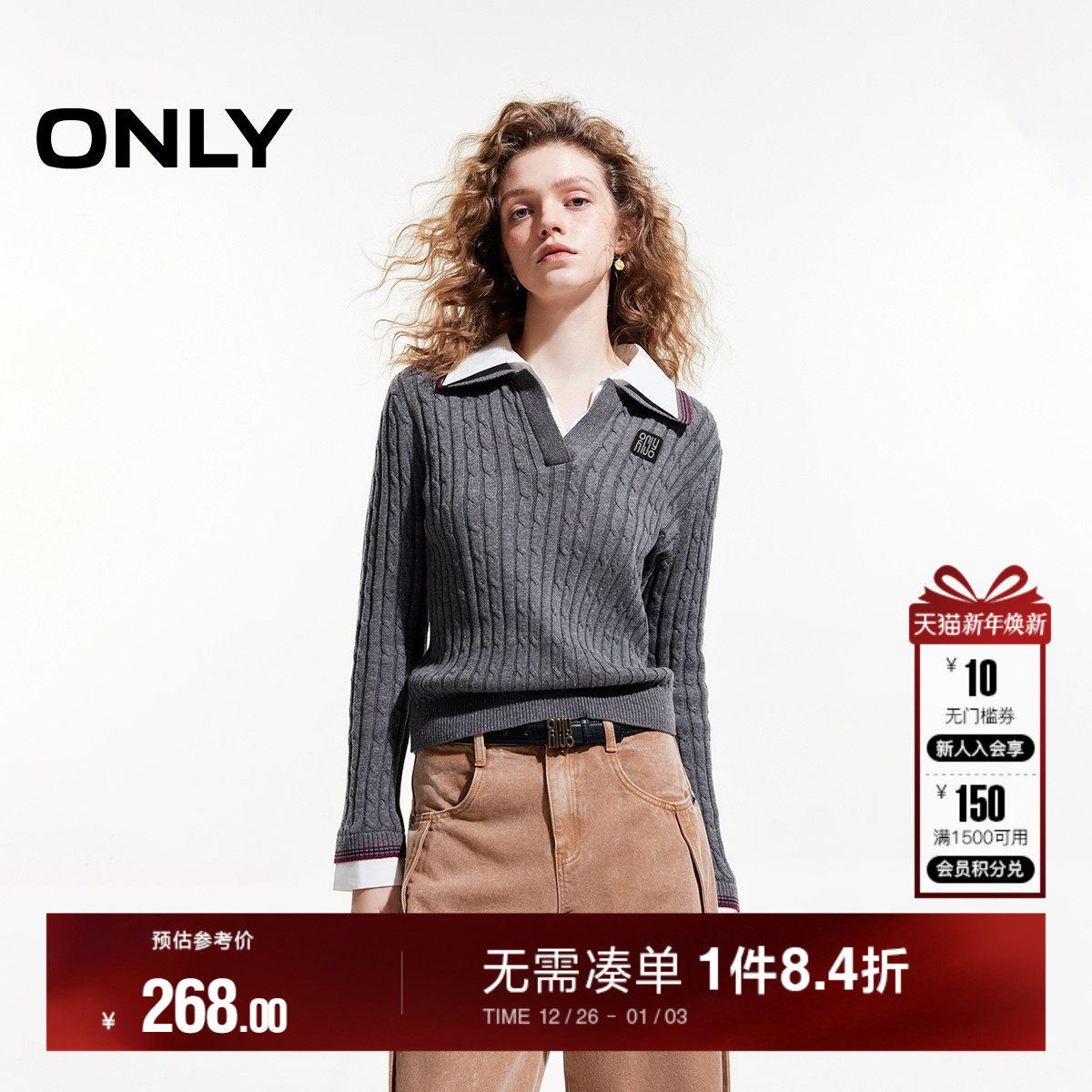 ONLY2025冬季学院风假两件撞色拼接翻领立体麻花绞花针织衫女