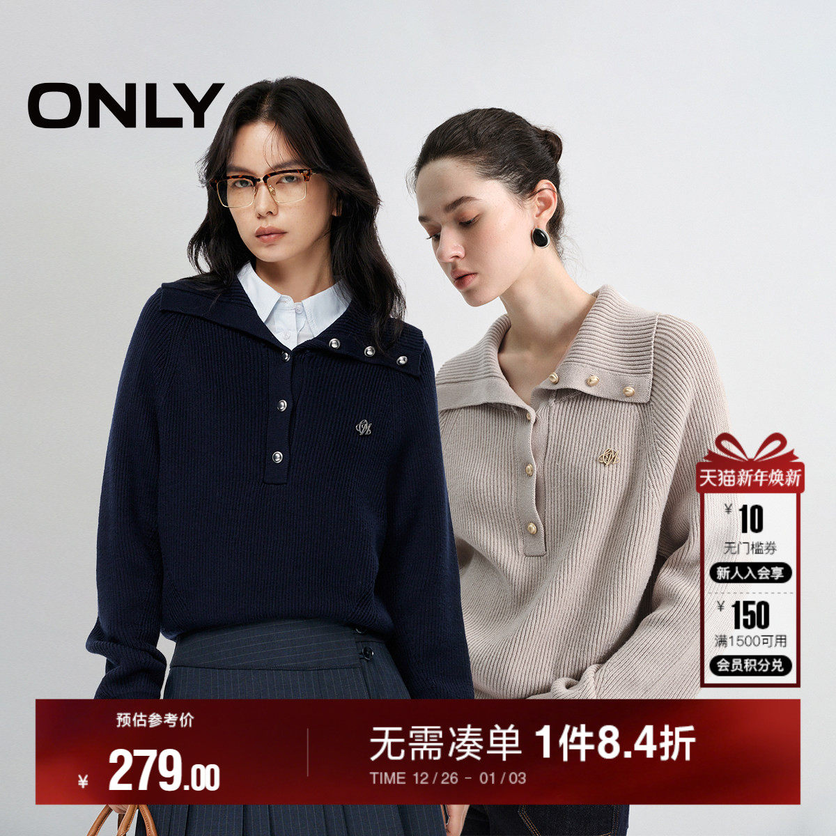 ONLY2025冬季新款高智感polo领长袖微落肩纽扣纯色修身针织衫女