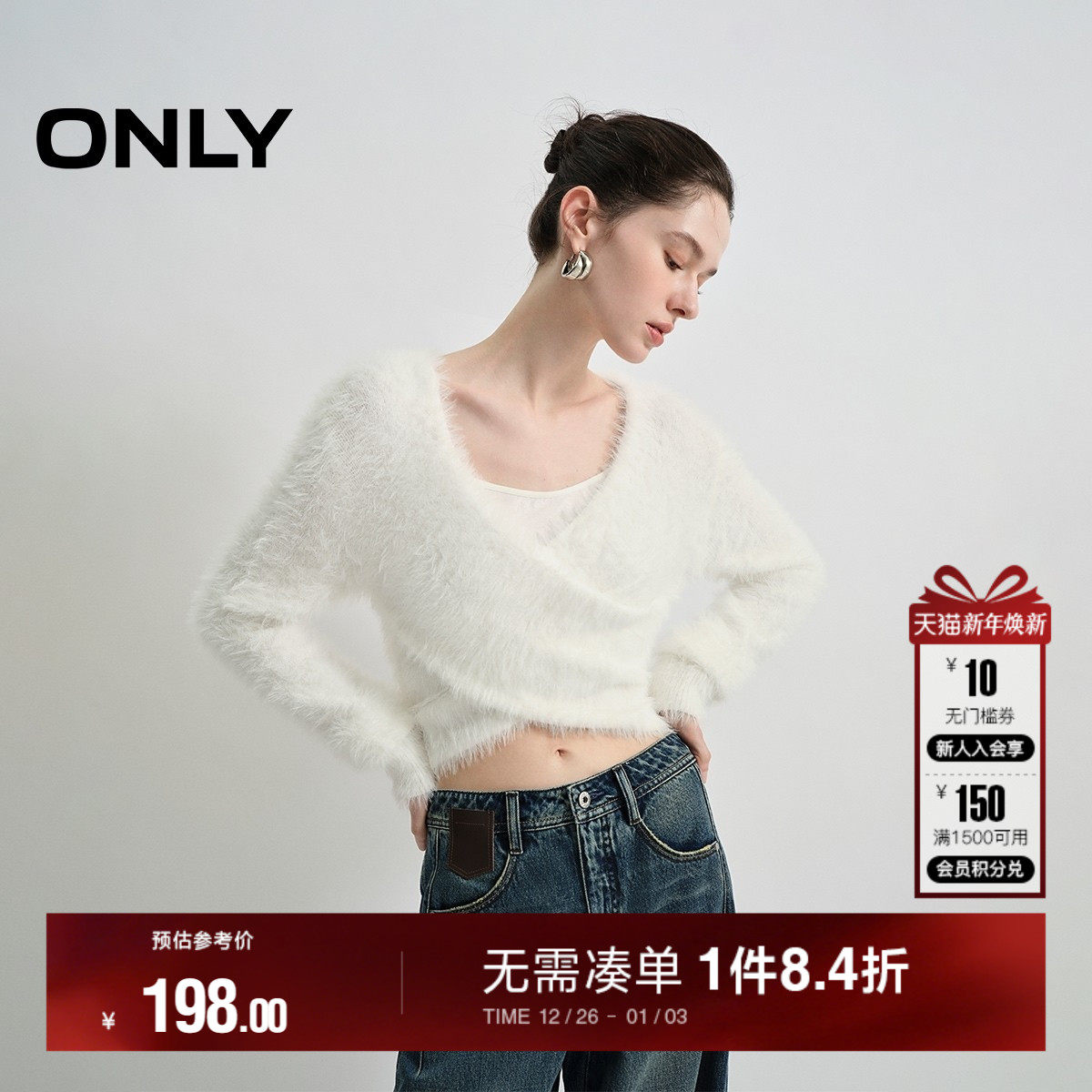 ONLY2025冬季新款优雅叠拼深V领口纯色亲肤软糯毛感短款针织衫女