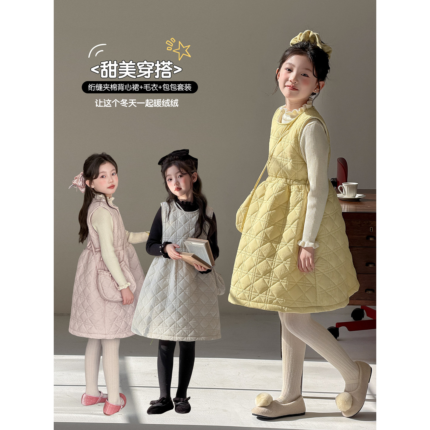 波拉女童连衣裙套装高端轻奢冬季新款儿童年款夹棉背心裙加厚裙子