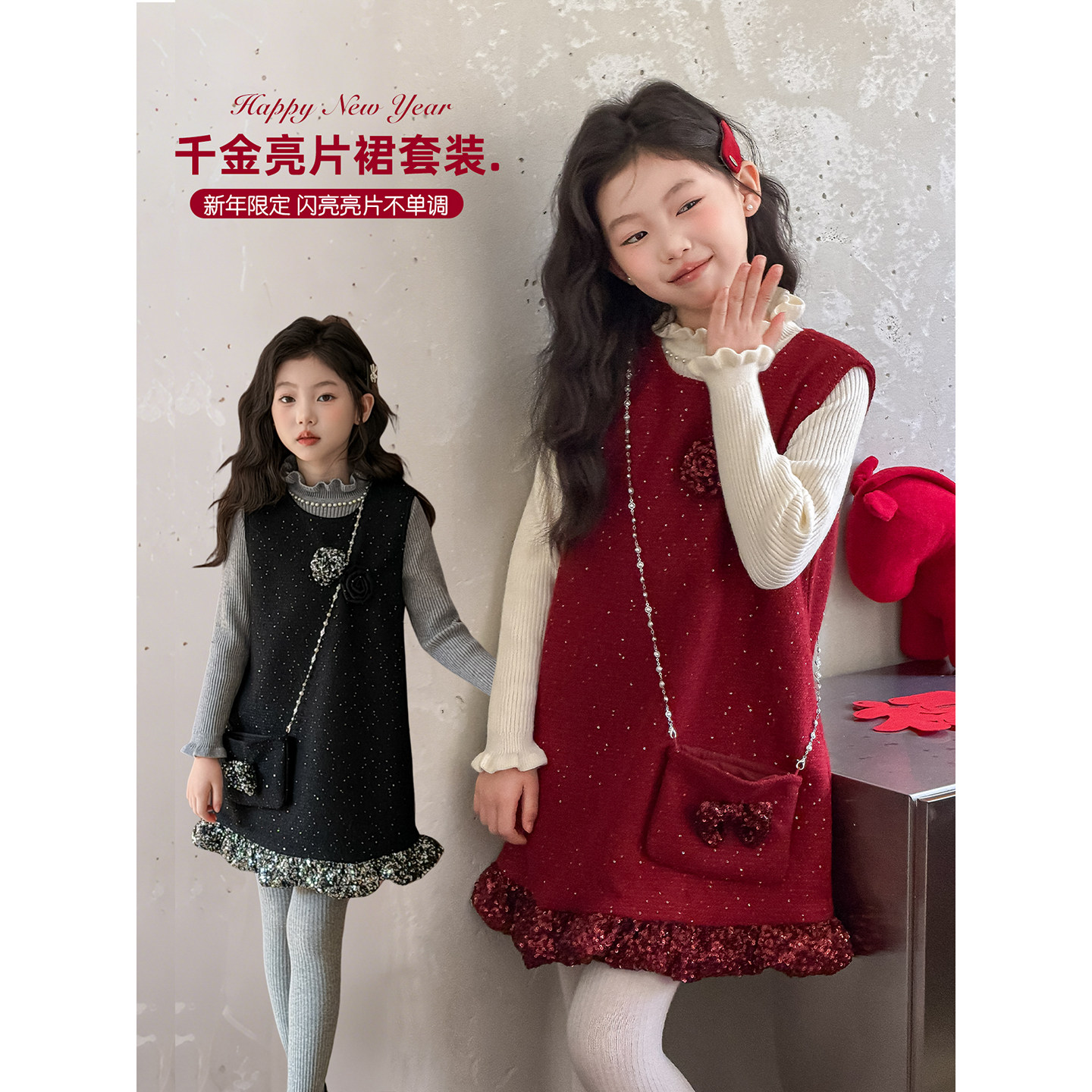 波拉女童连衣裙套装高端轻奢冬季新款儿童新年装女孩洋气背心裙子