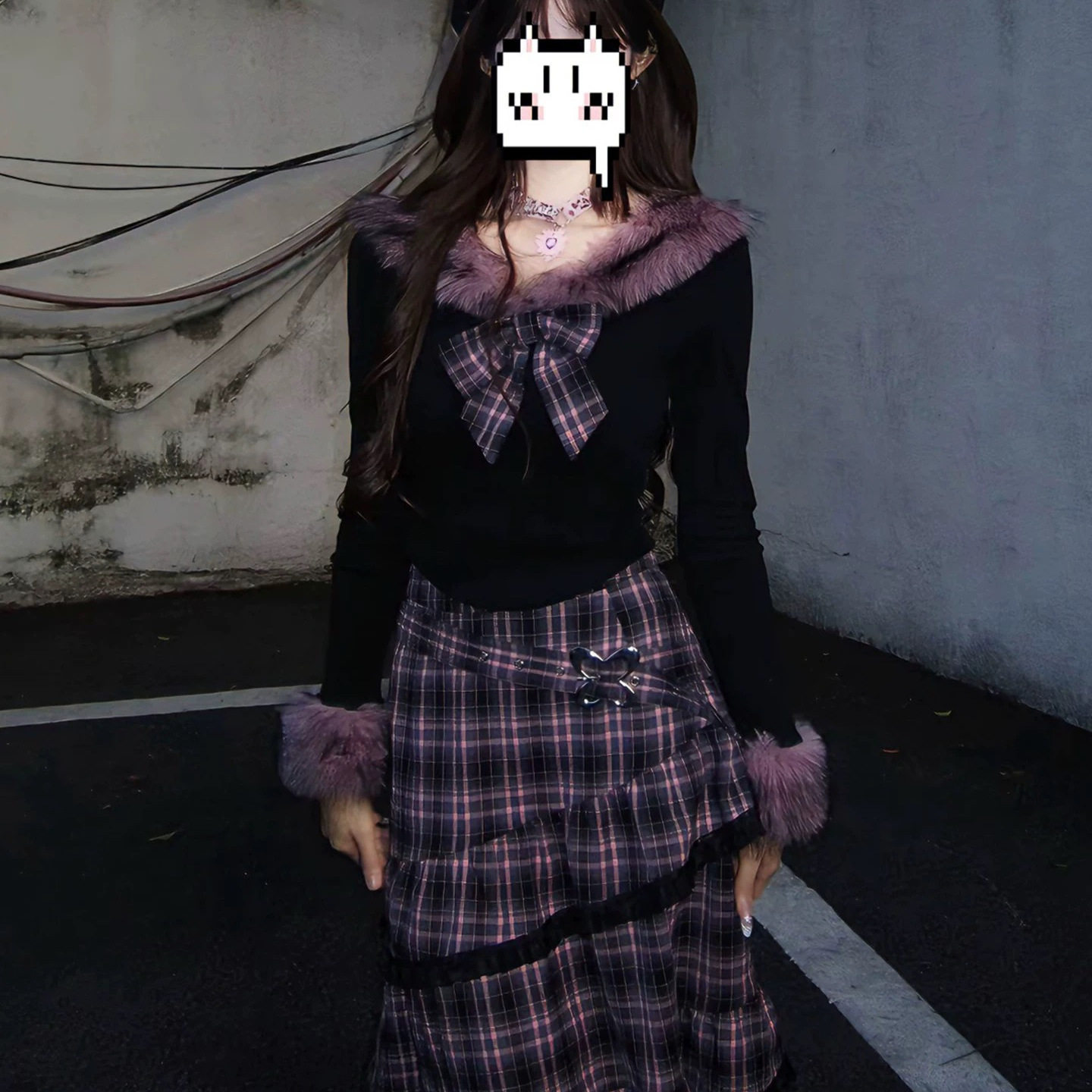 鬼马少女小香风miu系千金格子连衣裙秋冬毛领上衣半身长裙两件套