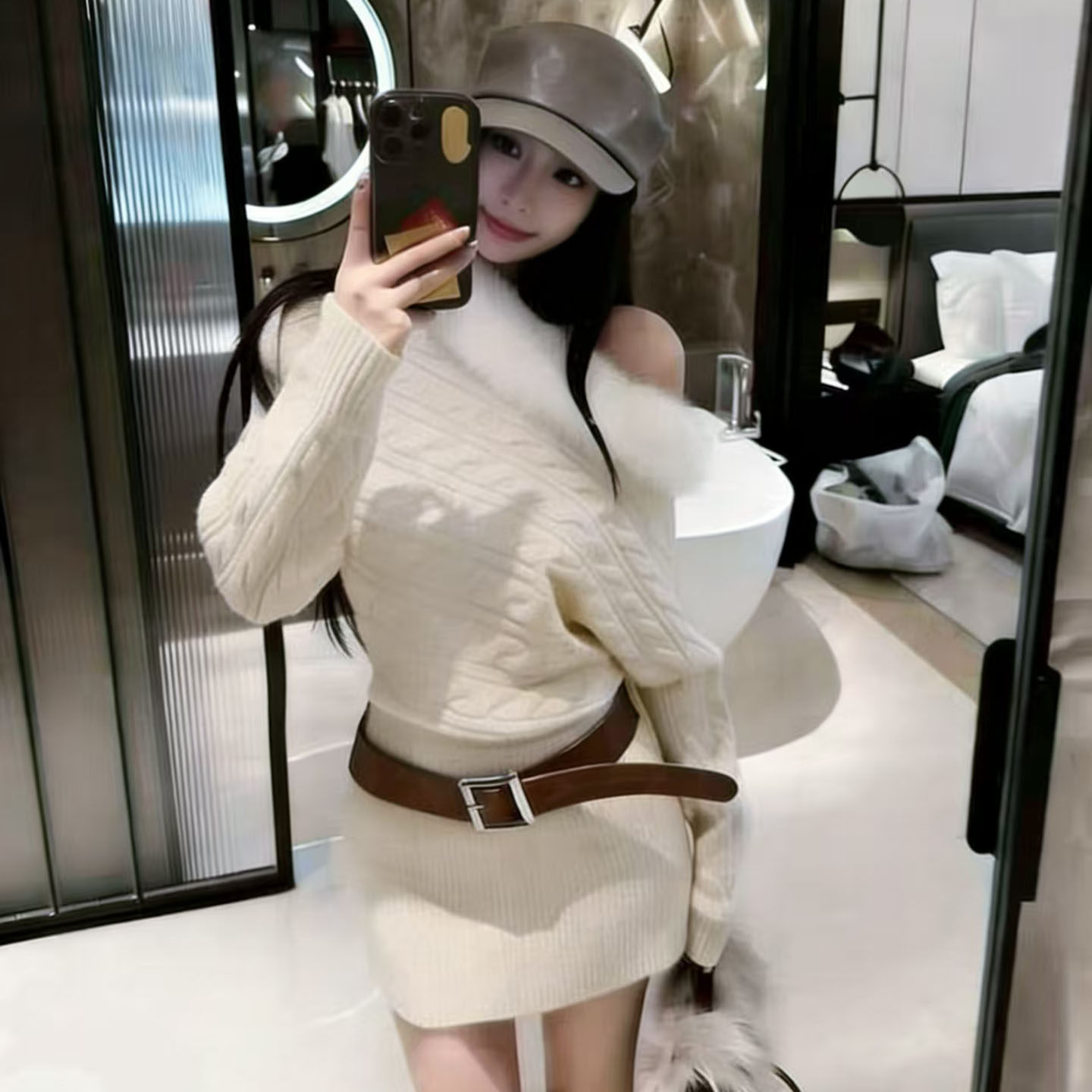 毛毛领露肩麻花毛衣裙女秋冬新款收腰显瘦包臀裙气质穿搭连衣裙潮