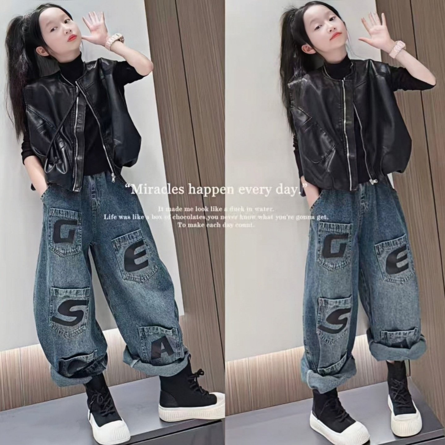 潮酷女童黑色皮马甲套装春秋新款洋气时髦中大童坎肩背心外套上衣