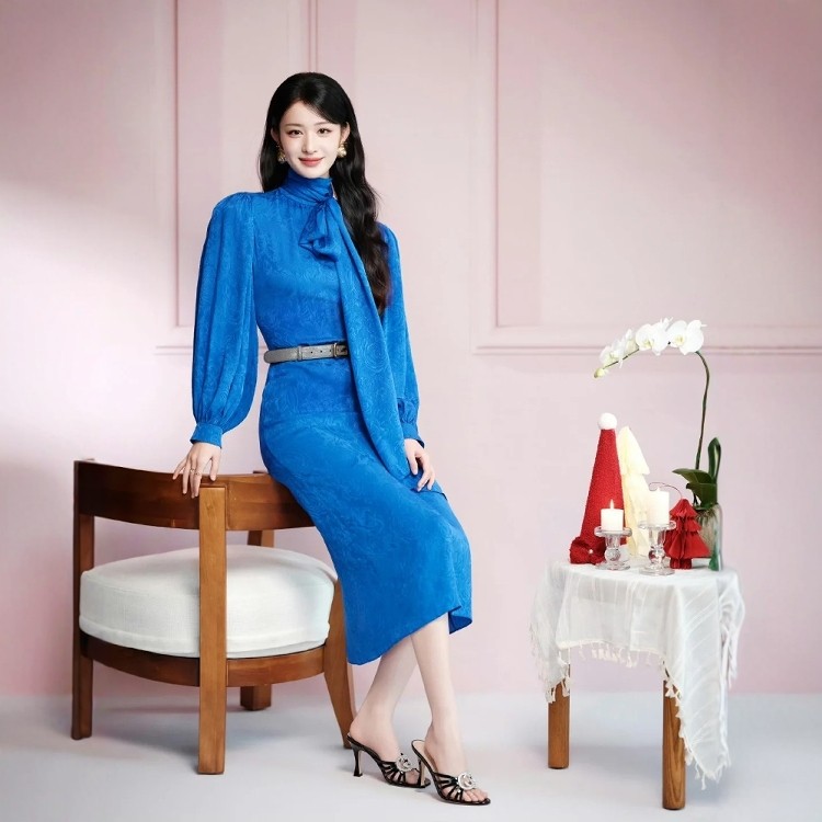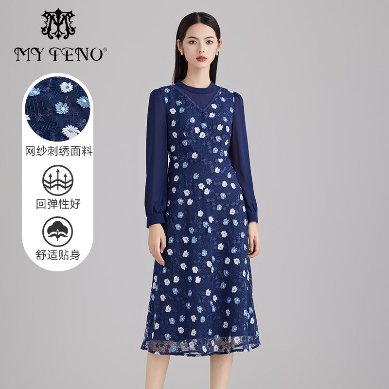 - 小四原创 欧洲站秋冬装新款碎花加绒加厚雪纺中长款打底连衣裙女