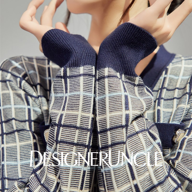 马天奴春秋新款女宝蓝色V领拼接连衣裙子千鸟格印花收腰长裙时尚