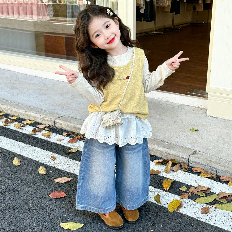 女童针织套装春秋装2026新款春季儿童马甲T恤牛仔裤小女孩三件套t