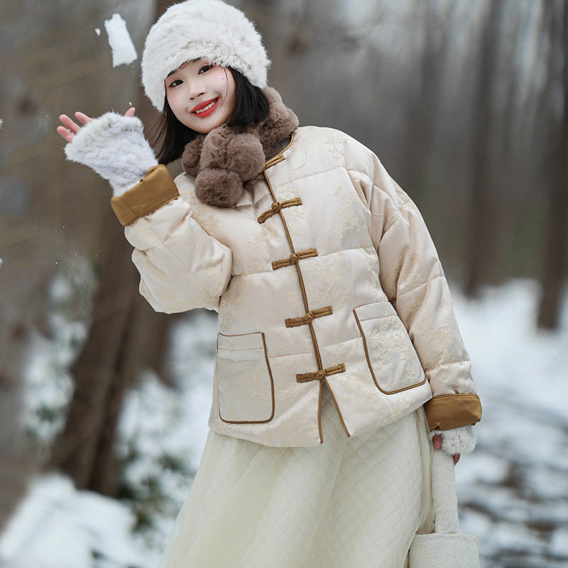 冬季新款复古立领白鸭绒盘扣羽绒服女洋气休闲宽松纯色加厚短外套
