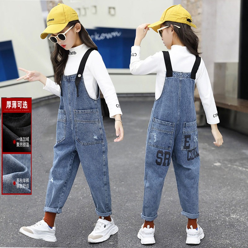 十岁女童背带裤秋冬宽松中童大童加绒连体K牛仔裤小学生时尚休闲