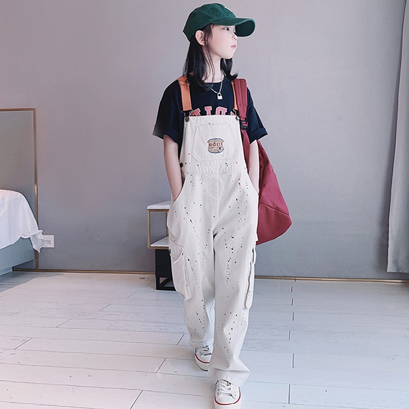 女童背带裤秋季宽松2025新款儿童秋装喷墨复古美式工装牛仔裤韩版