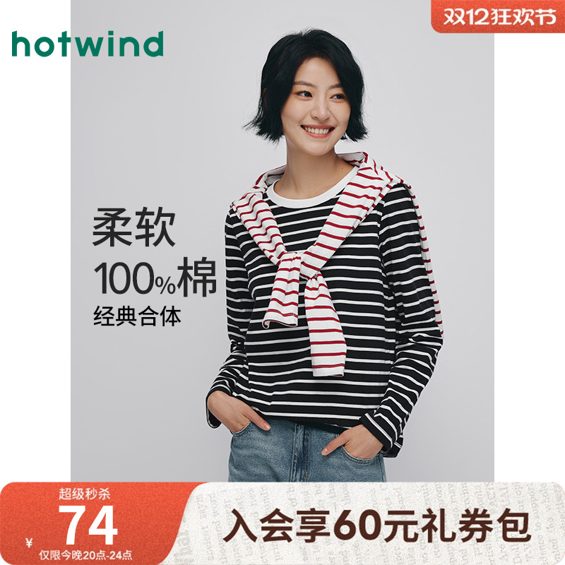 热风女士条纹长袖T恤2025年秋季新款休闲基础款圆领纯棉t恤上衣