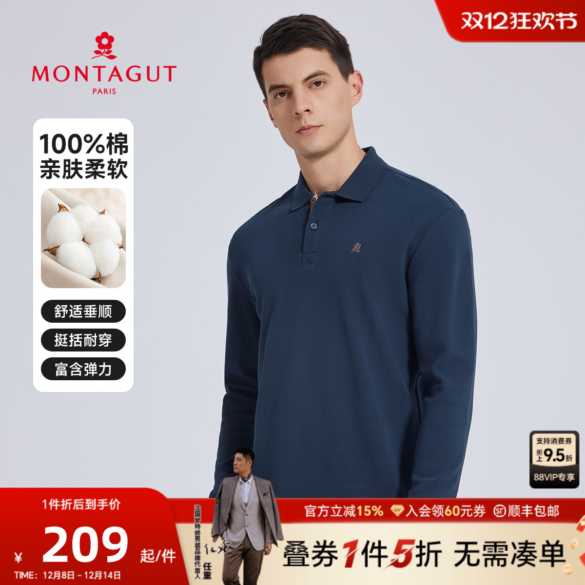 [100%长绒棉]梦特娇男士长袖Polo衫翻领春秋丝光纯棉T恤爸爸婚宴J